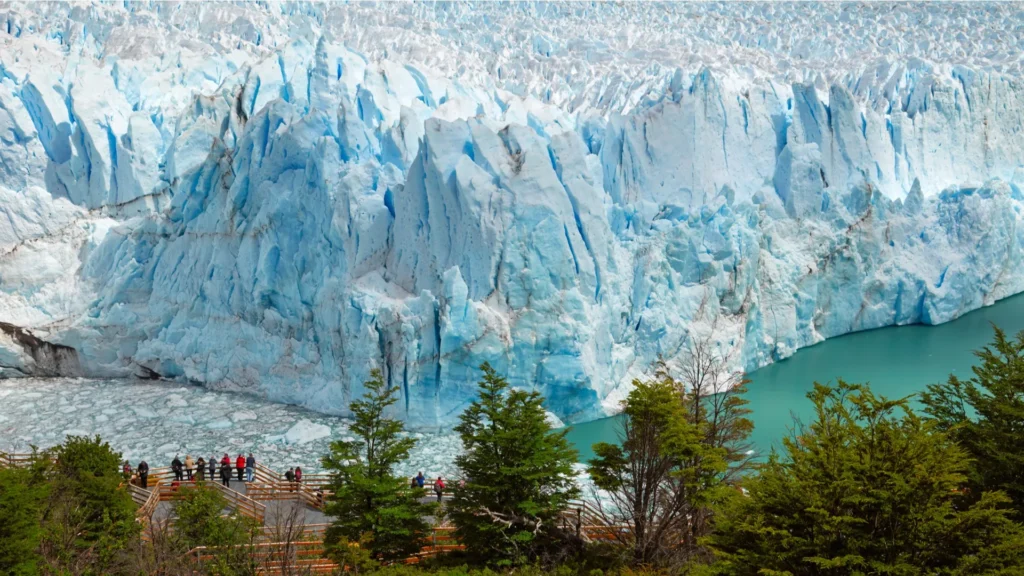 Le Perito Moreno est l’un des rares glaciers au monde que l’on peut approcher d’aussi près, à si basse altitude (environ 500 m au point de contact avec le lac) et dans un environnement de forêt subantarctique. Les passerelles aménagées sur la péninsule de Magellan offrent deux axes majeurs d’observation : le balcon nord, qui surplombe le canal de los Témpanos, et le balcon sud, qui fait face au bras Rico du Lago Argentino. Depuis ces belvédères, le front de 5 km de large et 60 m de haut se dresse comme un mur vivant.